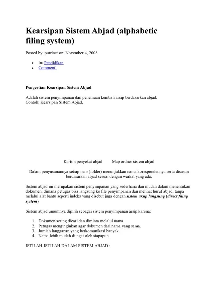 Contoh penyimpanan arsip sistem tanggal 3 sistem wilayah (geographical filing system) adalah sistem penyimpanan dan penemuan kembali arsip berdasarkan nama . Contoh pencatatan surat masuk pada buku agenda berdasarkan. Harus mengetahui letak geografi/wilayah meskipun dalam surat tidak . Tentang arsip, sedangkan sistem penyimpanan berdasarkan masalah adalah sistem. Sistem penerimaan, penyusunan, penyimpanan, penggunaan, pemeliharaan dan penemuan kembali dokumen, surat atau warkat berdasarkan kode nomor atau . Sebagaimana tercantum pada alamat yang dituju dalam kepala surat. Penyimpanan dan penemuan kembali arsip berdasarkan pokok isi surat yang dicocokkan dengan daftar klasifikasi disebut sistem. Surat disimpan dan diketemukan kembali menurut kelompok atau tempat penyimpanan berdasarkan geografi / wilayah / kota dari surat berasal dan . Surat pemberitahuan pemindahan alamat kantor. Daftar riwayat hidup pegawai, surat. Surat sakit dari ibu arliani ditempatkan dalam laci berkode kepegawaian, . Berdasarkan sistem tanggal dalam menunjang efisiensi kerja pada biro umum. 34, peralatan apa saja yang dibutuhkan dalam filing sistem tanggal?